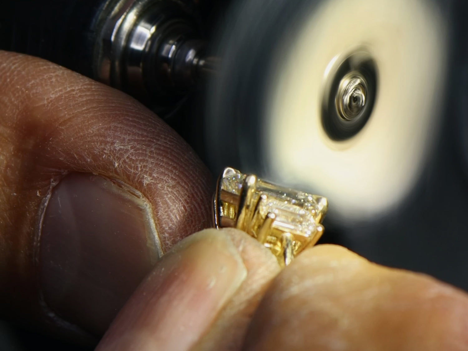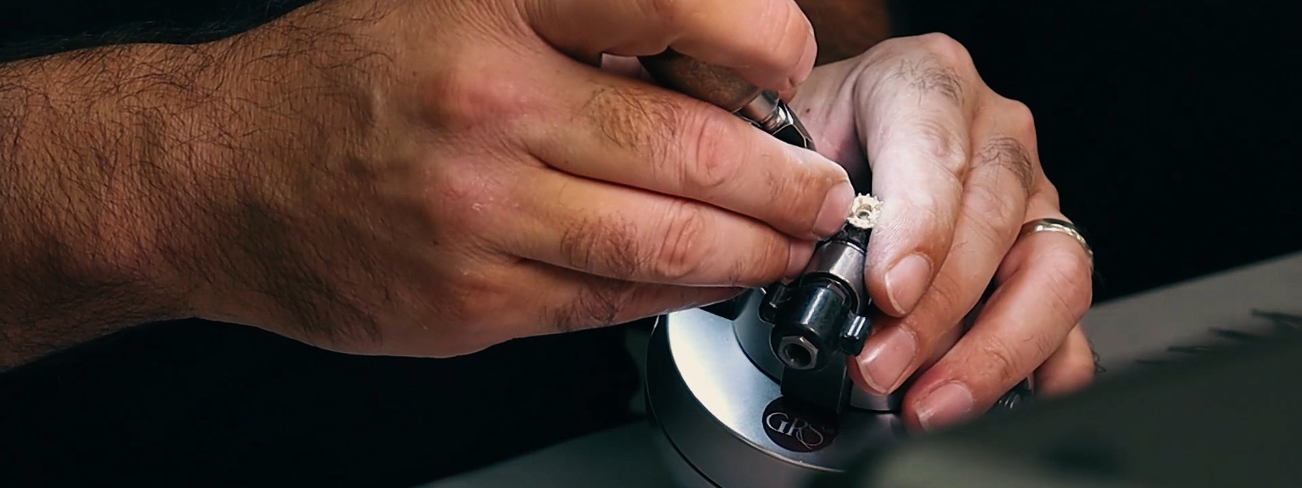 During this stage, the gemstone is precisely positioned and securely set under a 45x Leica microscope to ensure lasting stability while enhancing its beauty and the ring’s overall design.