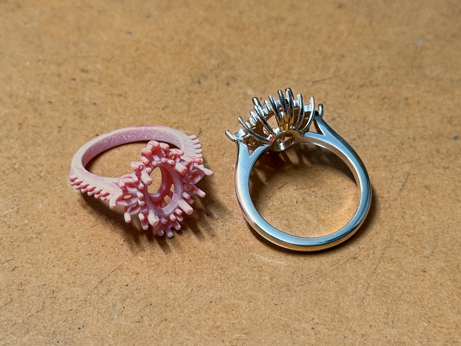 Starting from a digital design file, the ring is brought to life through high-precision 3D printing, producing a wax model that serves as a mold for casting the ring to it's final metal structure.