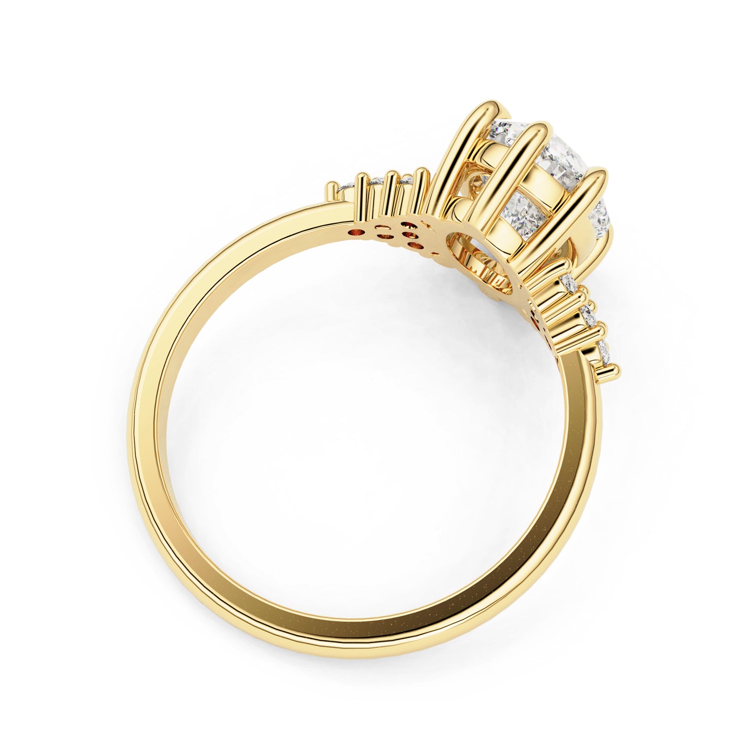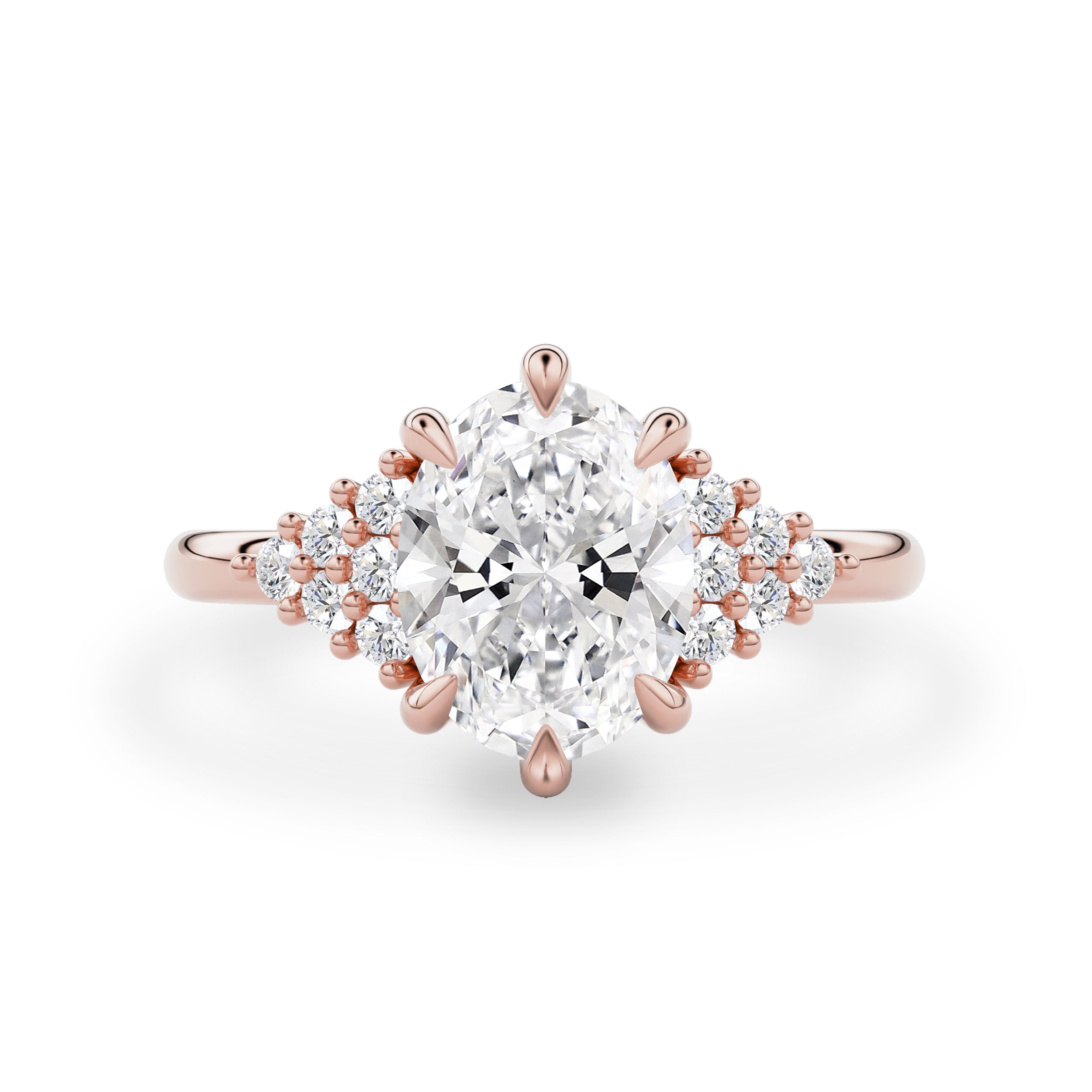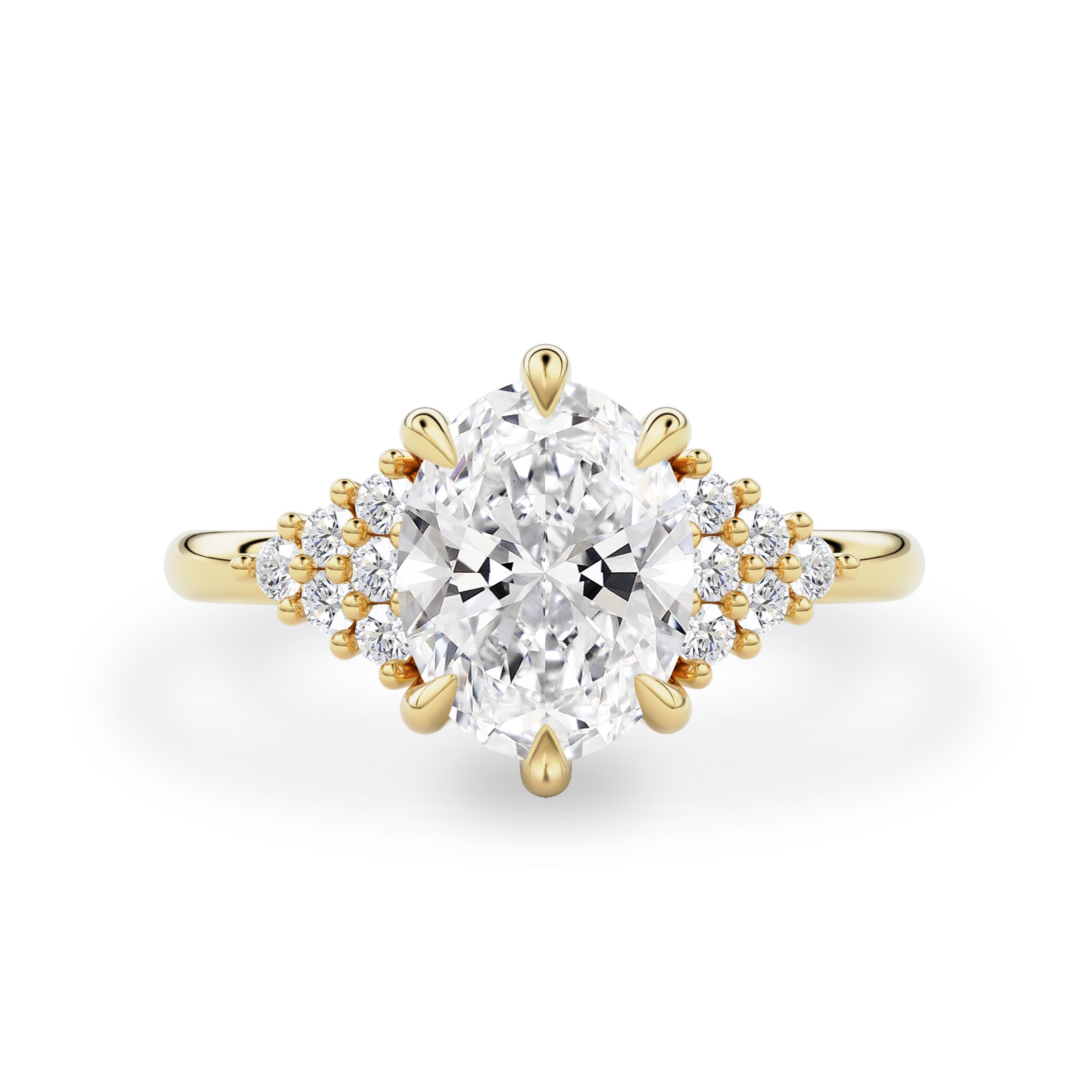 Classic simplicity defines this elegant Emma Engagement Ring. It features a 14k solid gold half-round band with a triangle form of small accents on each side of the center stone. The center features six tiger/round claws holding the oval cut moissanite/lab-grown diamond in the basket setting.