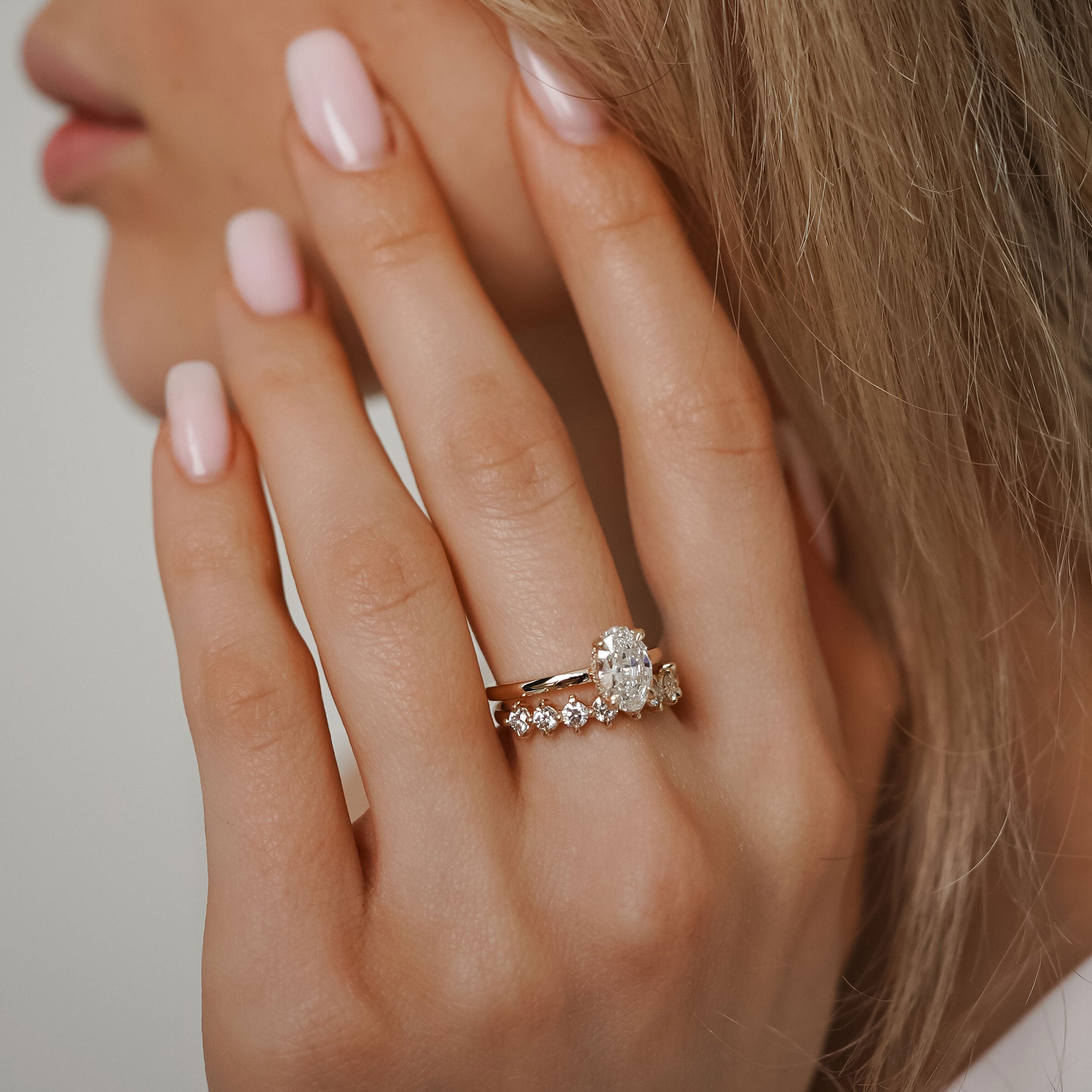 Introducing our Ivy Engagement Ring, a stunning symbol of love and commitment. This captivating piece showcases an oval-cut moissanite set with delicate tiger claws, emphasizing its natural brilliance and allure.