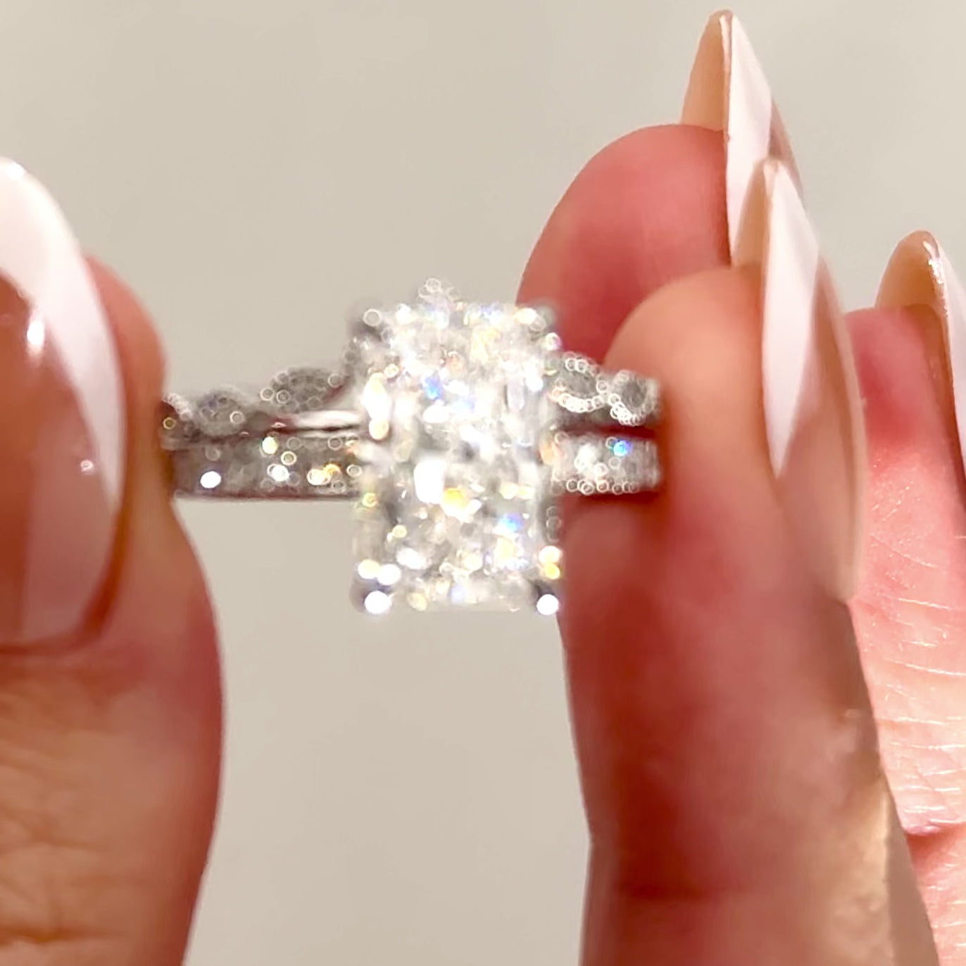 - Moissanite By Bellisa, Radiant Cut, VVS Clarity, D Color.