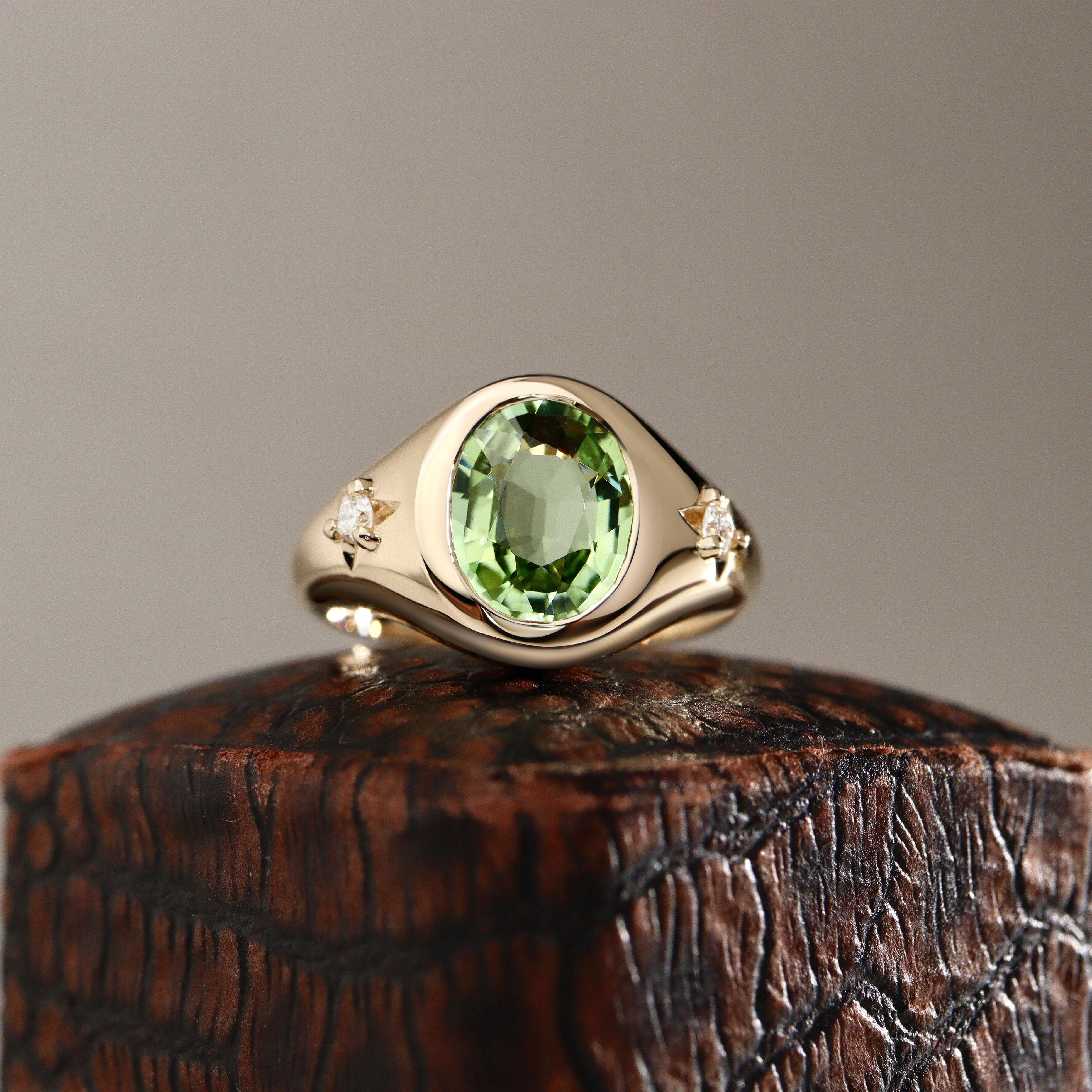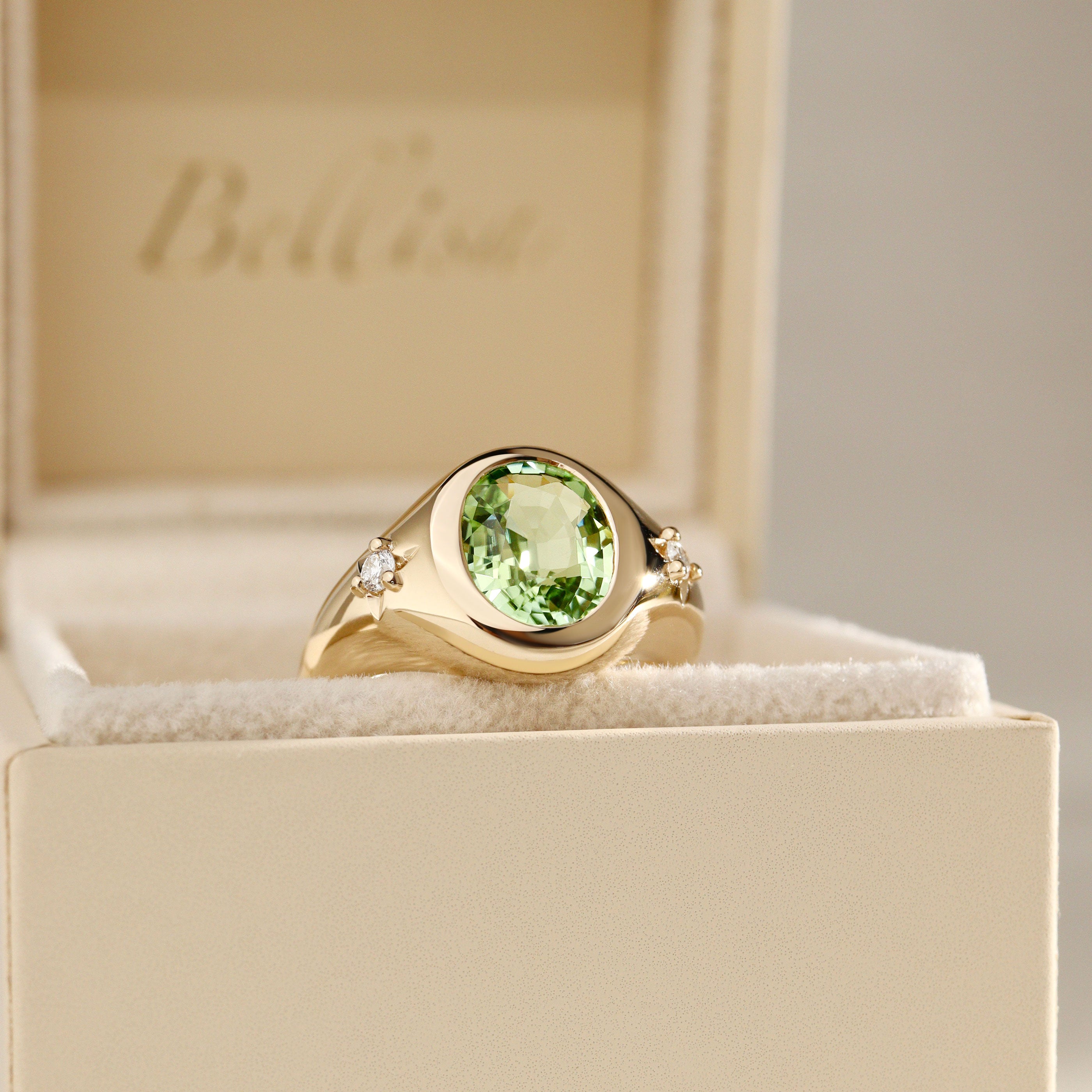 With an ethically sourced tourmaline set in a bezel, this ring is meant to shine under any circumstances. On the ring shank, we add an engraved star setting with natural white diamonds that give it a vintage touch.