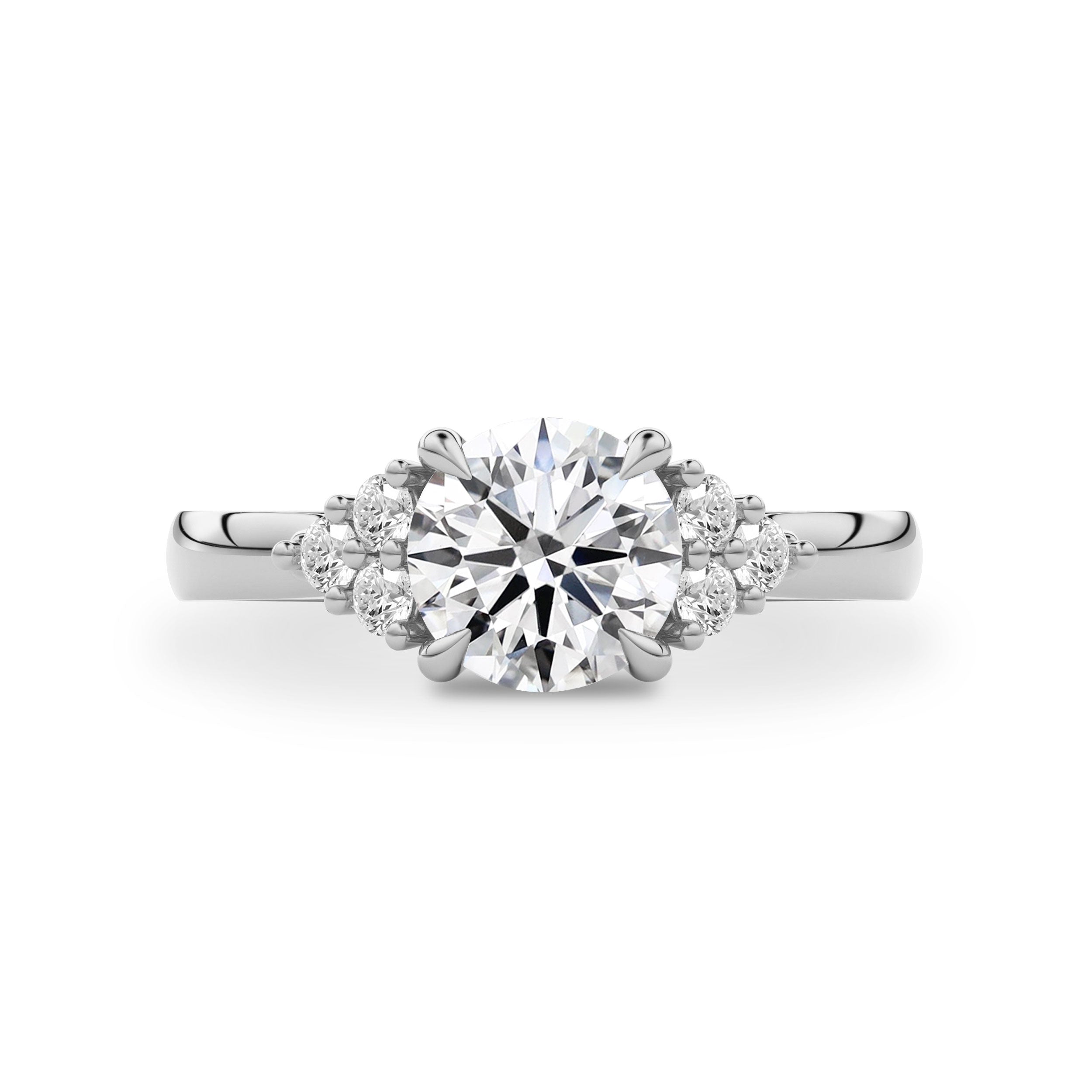 Refined, but with classy cathedral shank appeal. This ring centers with a tiger prong-set of a high-quality round brilliant cut gemstone, accompanied by six round brilliant cut accent stones, three on each side. The ring shank features an offset stone seat, which creates a unique look and allows the light to shine through.