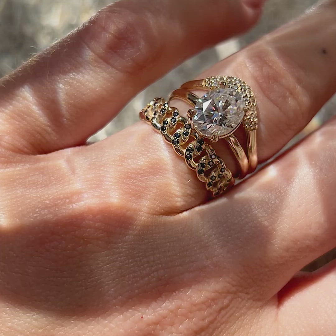 This curb chain ring is sparkled with natural black/white diamonds along the links. With an interlocking chainlink-inspired silhouette, our Starry Sky Curb Link Band Ring brings a unique flair to every look. Designed to be worn alone, or paired with other rings to make a statement.