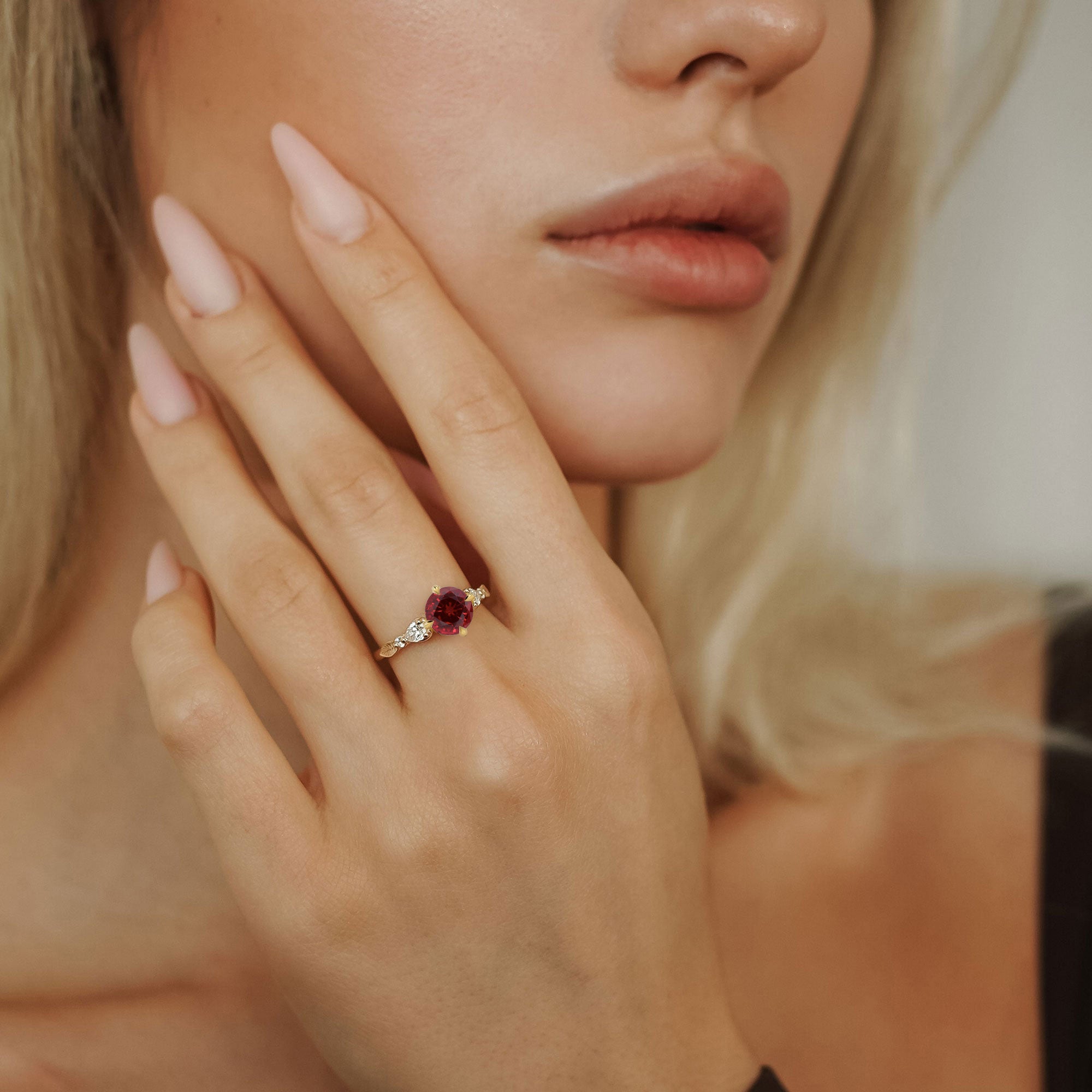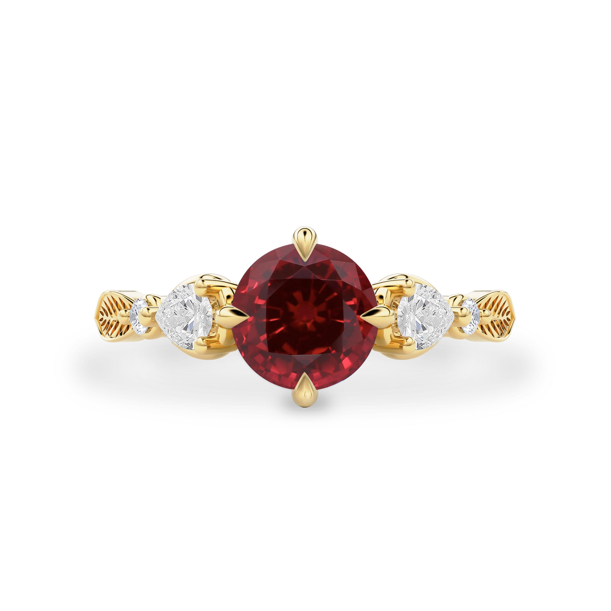 Madison Round Lab Ruby Art Deco Leaf Engagement Ring, Compass Set