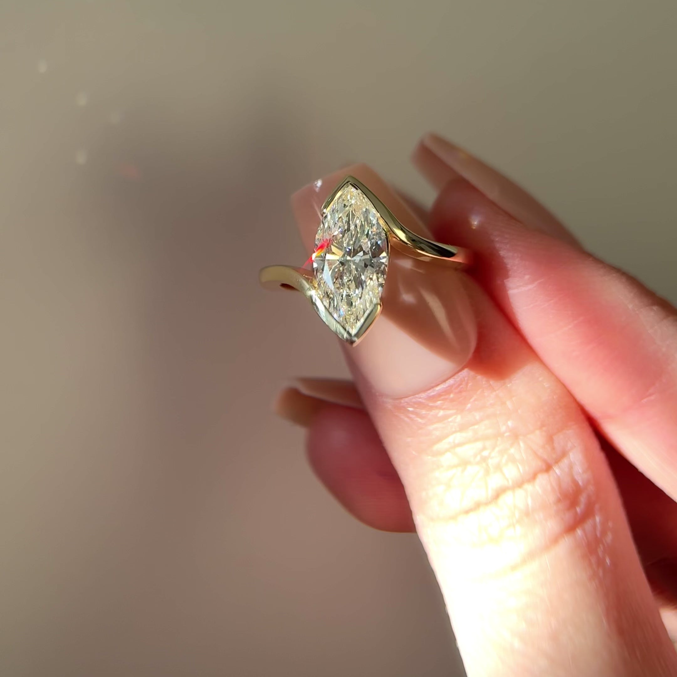 Presenting the Selene Marquise Half Bezel Bypass Engagement Ring, a modern twist on timeless elegance. Featuring a marquise-cut center stone gracefully embraced by a fluid half-bezel design, the band curves organically to highlight the center stone's brilliance while ensuring a secure, low-profile setting. Handcrafted in solid gold, this ring embodies both sophistication and everyday wearability.